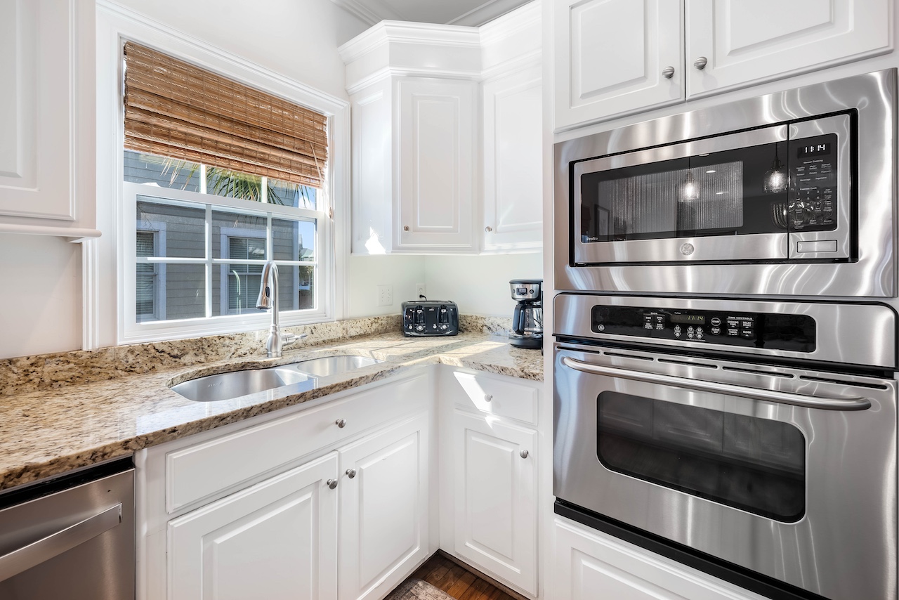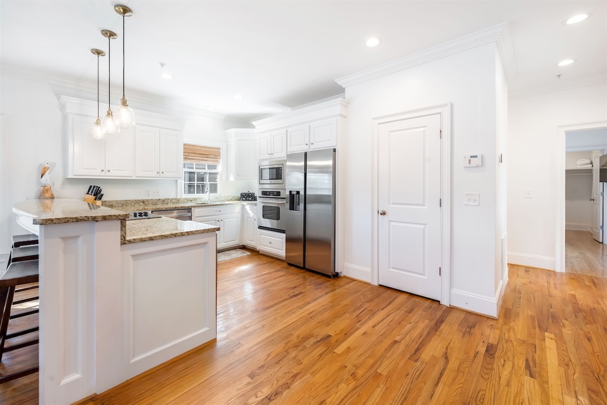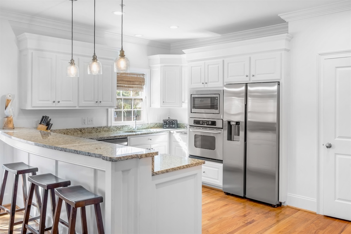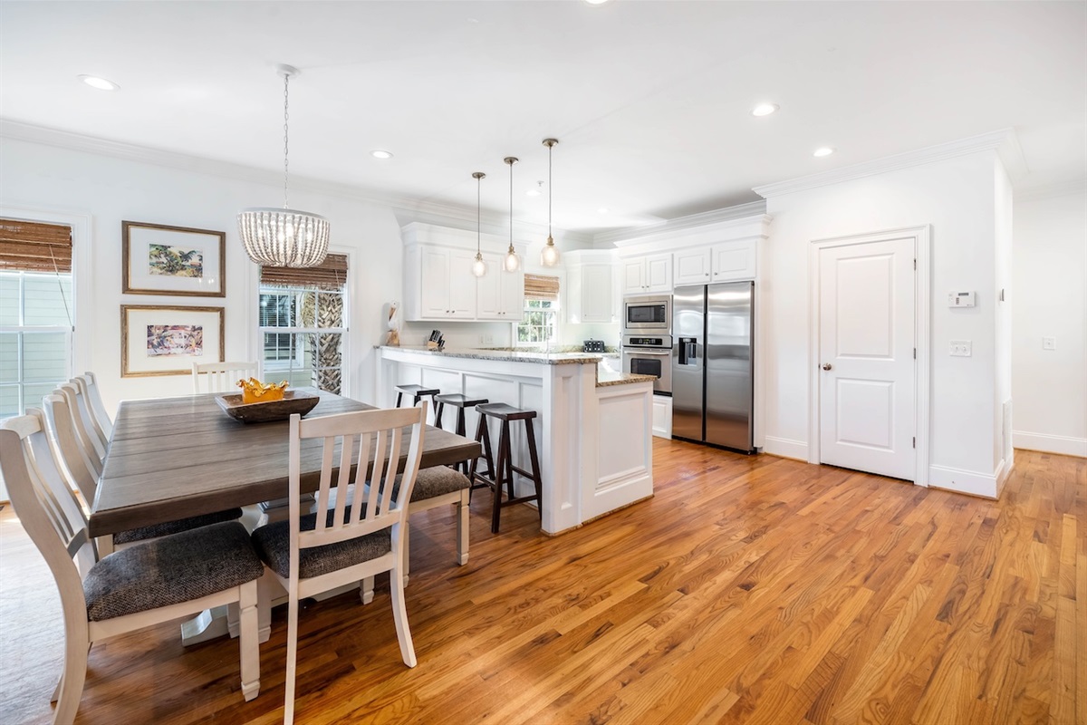 The fully equipped kitchen includes an oven, stove, refrigerator, dishwasher, microwave, and ample cookware and serveware. A convenient kitchen island and dining table create a natural hub for breakfast spreads, casual snacks, and family dinners. Morning coffee is a breeze with the coffee maker and toaster, and there’s even a blender, baking sheets, and grill utensils for those who love to cook.