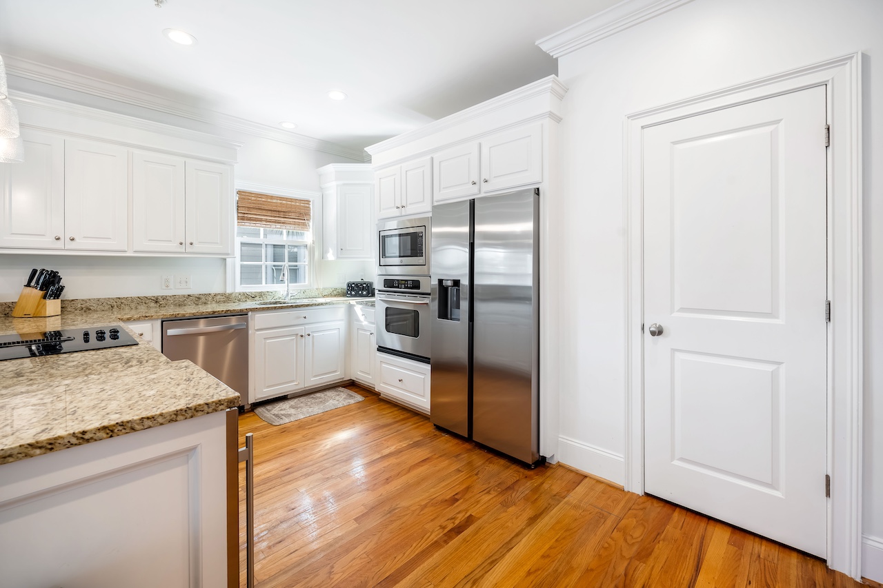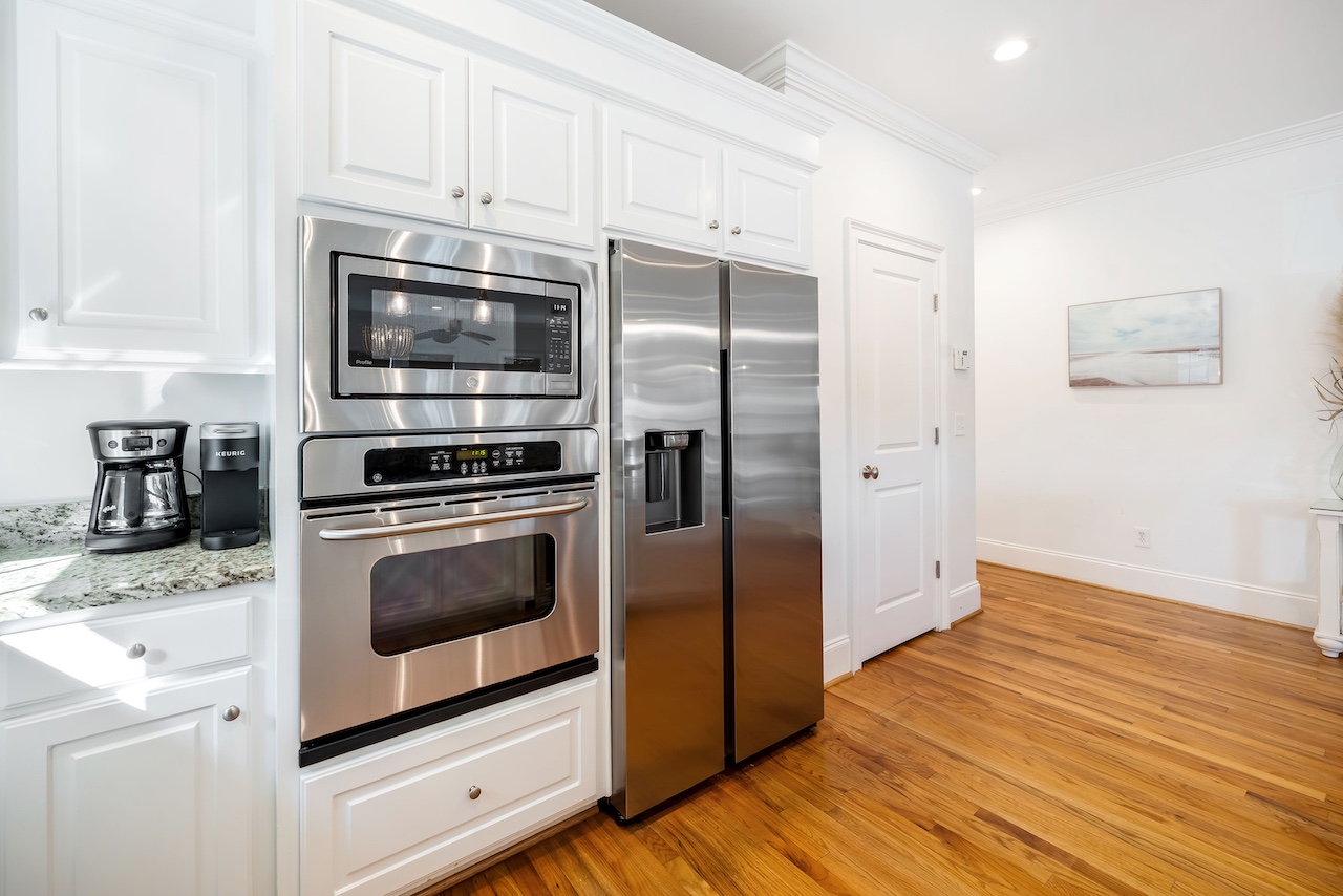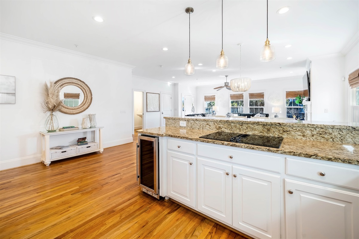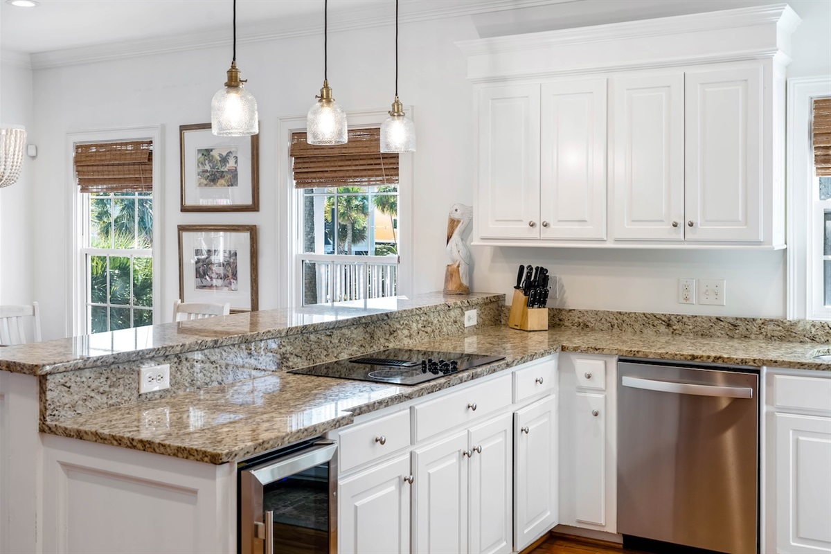The fully equipped kitchen includes an oven, stove, refrigerator, dishwasher, microwave, and ample cookware and serveware. A convenient kitchen island and dining table create a natural hub for breakfast spreads, casual snacks, and family dinners. Morning coffee is a breeze with the coffee maker and toaster, and there’s even a blender, baking sheets, and grill utensils for those who love to cook.