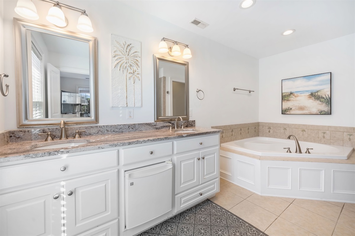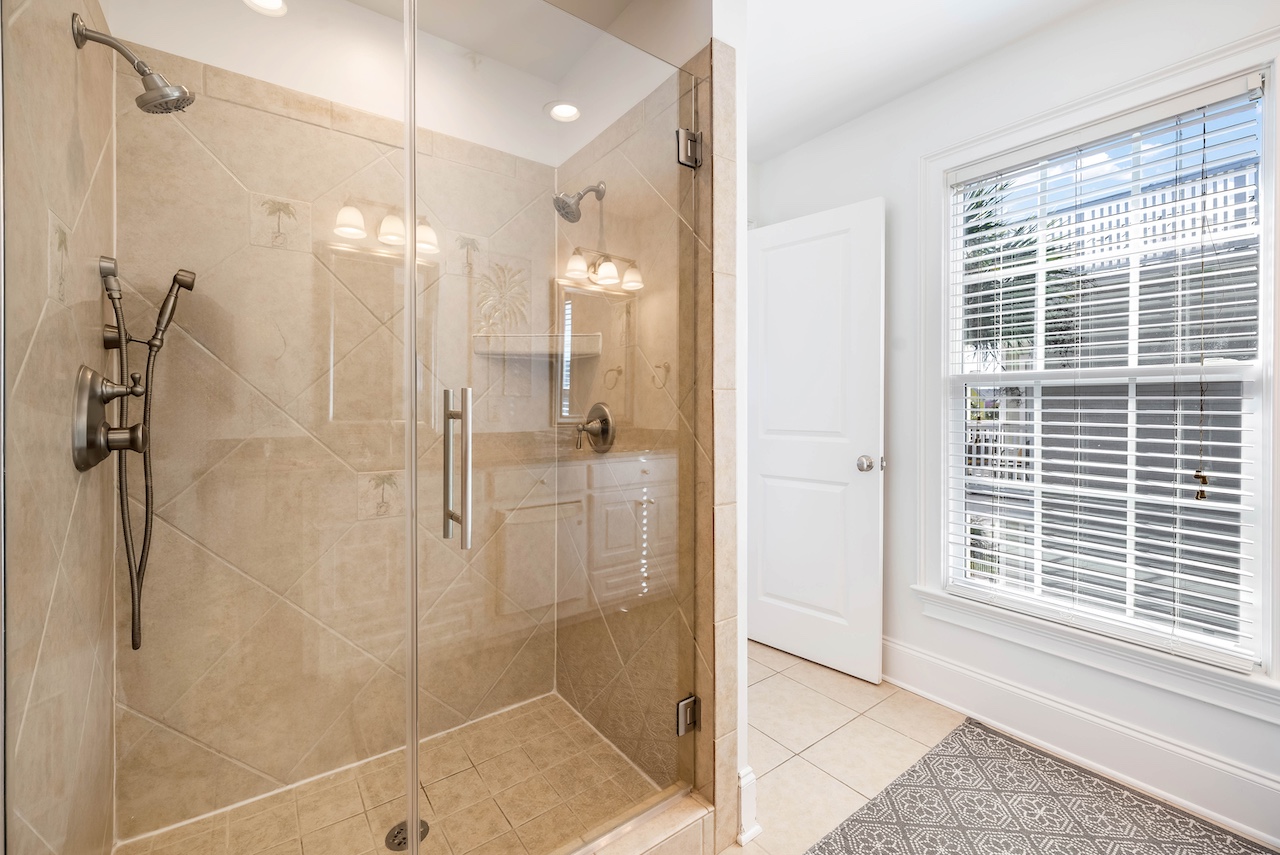 Five full bathrooms provide plenty of space for your group. The primary ensuite features a relaxing jetted tub and separate shower, perfect for unwinding after a day in the sun. Additional baths offer a mix of tub/shower combinations and a walk-in shower, with hot water, fresh towels, and basic soaps provided.