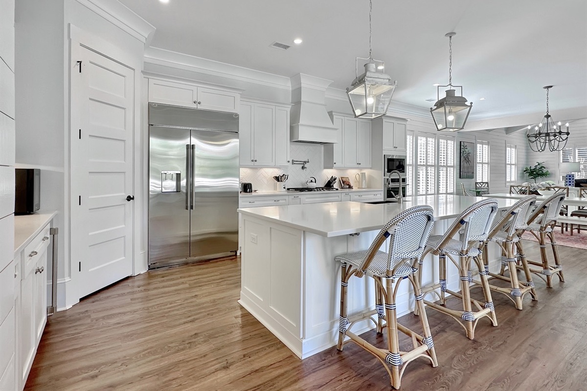 Create delicious meals in the chef’s kitchen, adorned with sleek countertops and stainless steel appliances, including two dishwashers. The breakfast bar accommodates four guests, while the dining table seats eight for shared meals.