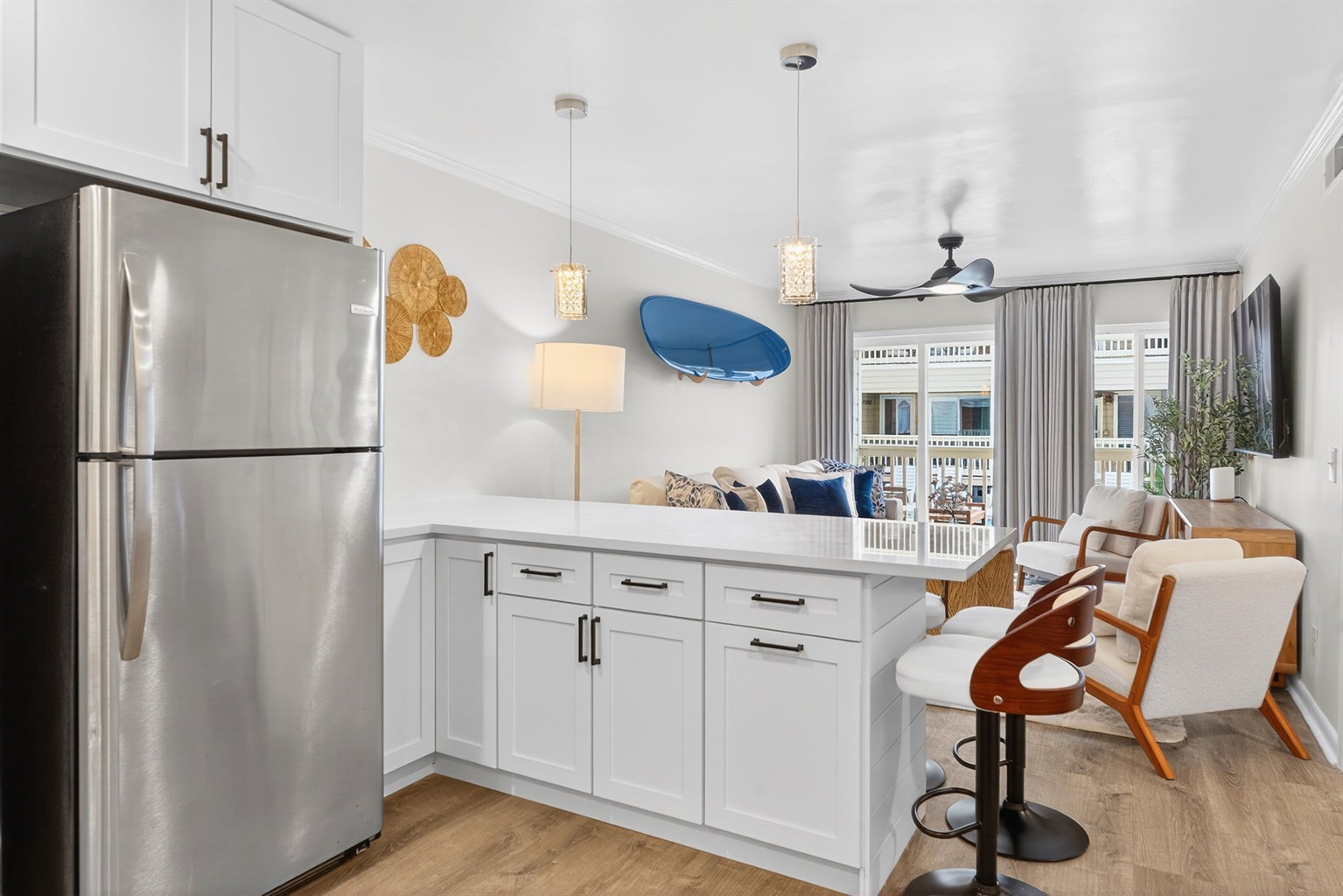 The kitchen is equipped for everything from quick breakfasts to easy dinners at home, featuring a kitchen island and a full suite of essentials including refrigerator, stove/oven, microwave, coffee maker, blender, toaster, freezer, and ice maker.