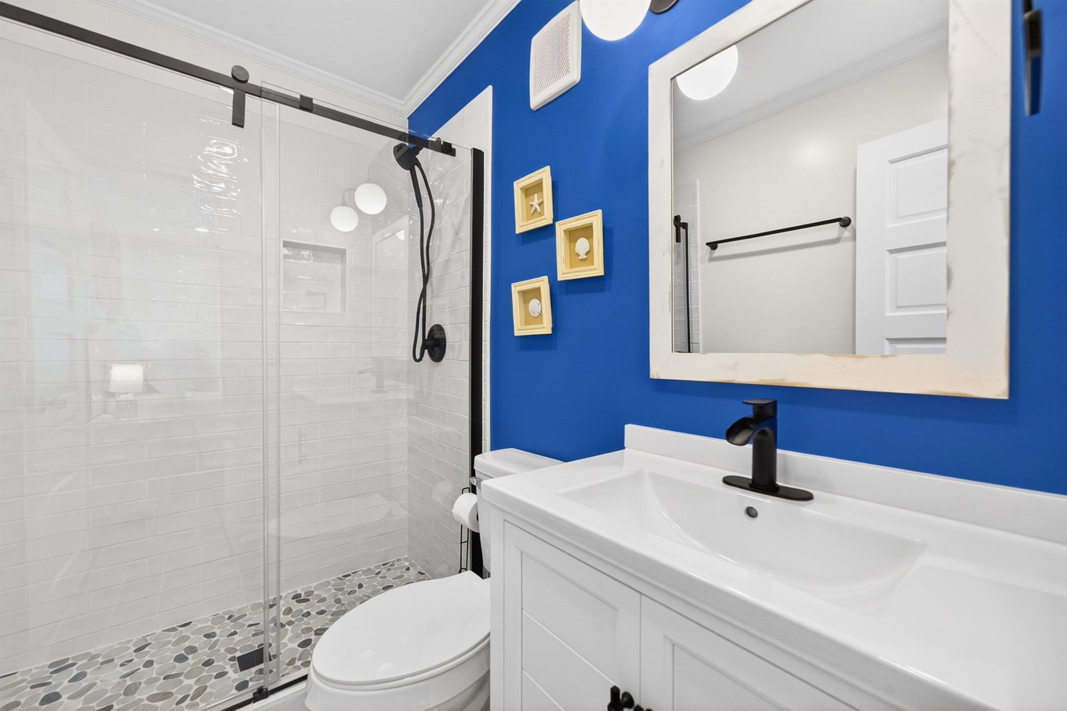 Two bathrooms include a primary ensuite with a walk-in shower and a second full bath with a tub/shower combo—ideal for post-beach rinses and easy mornings.