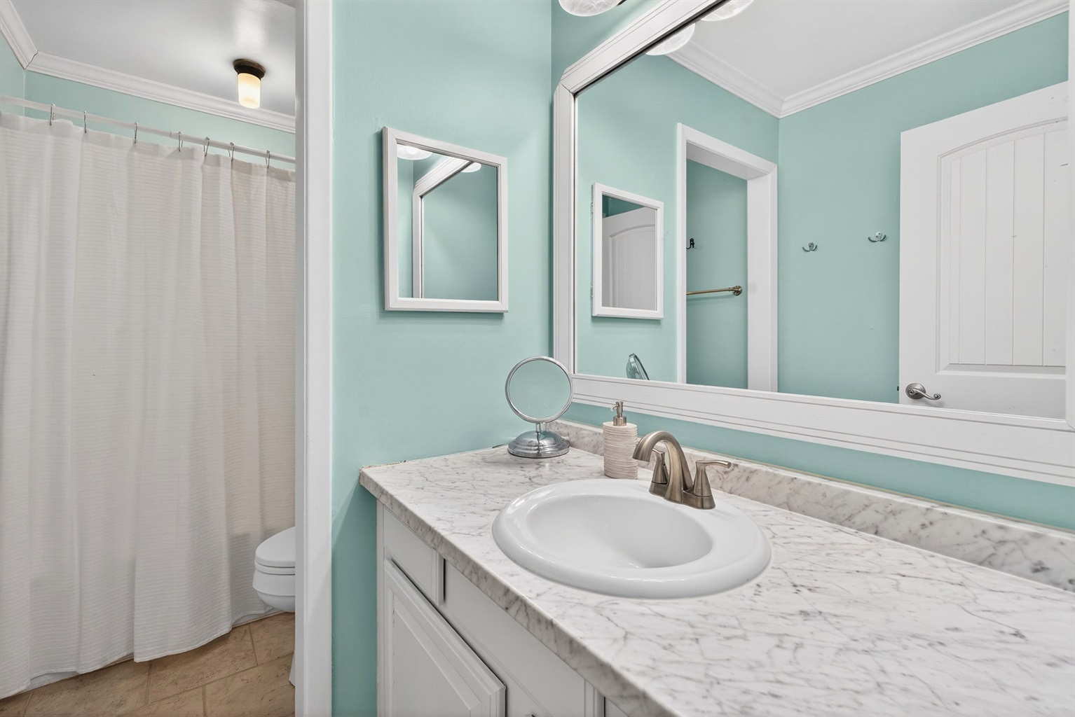 A hall bath with a tub/shower combination and toilet, convenient to the queen bedroom and bunk room.