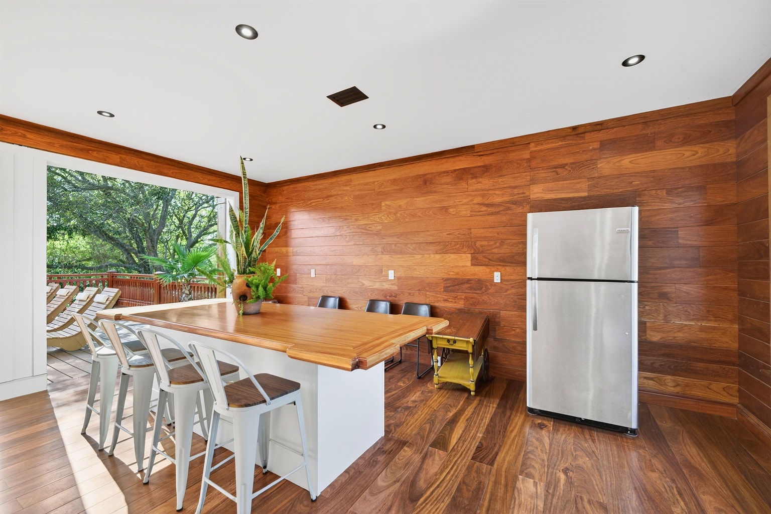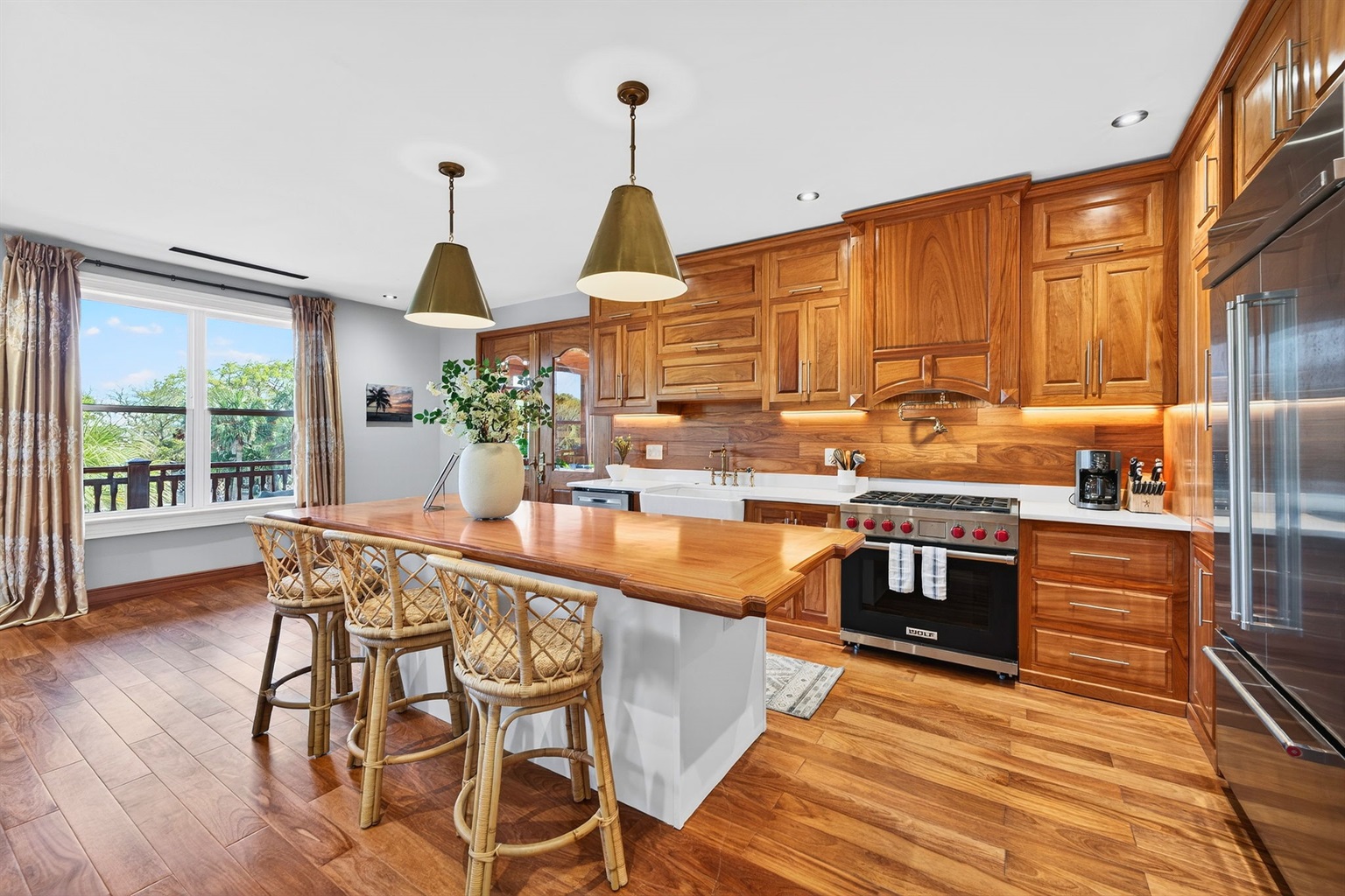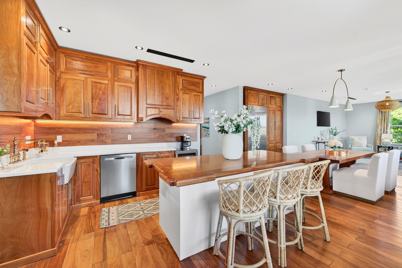 *Full chef’s kitchen with kitchen island, dining table, coffee maker, blender, and wine glasses