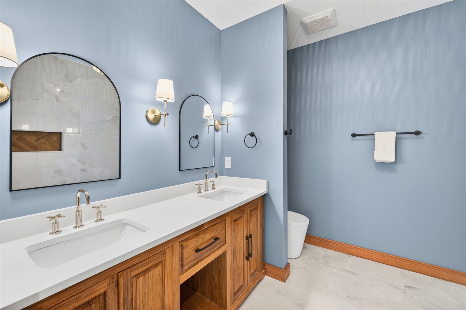 Eight full bathrooms bring comfort and flexibility to the home’s layout. The primary ensuite includes both a shower and soaking tub, and a second ensuite also features a tub in addition to a shower. The remaining bathrooms include walk-in shower setups that make rinsing off after a beach day feel simple and streamlined. Altogether, the bathroom design supports both privacy and ease for larger groups.